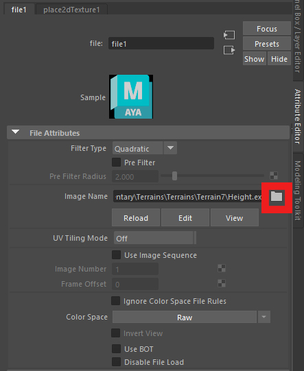 Attribute Editor will open, click on file icon and select your custom Height map.