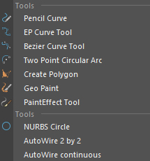 Basic Tools: right-click on the curve Icon to see a list of basic tools, things such as pencil curve – ep curve tool – create polygon and paint effect brush tool.