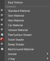 Right-click on this button will open a list of items which has the most common shaders, when you select something like standard Material, it will create the standard material of that render engine, for example in V-Ray it will make vrayMtl, in Arnold it will make aiStandard, for turtle it will make Blinn shader. Note that Turtle is also the default render engine for X-Ray.